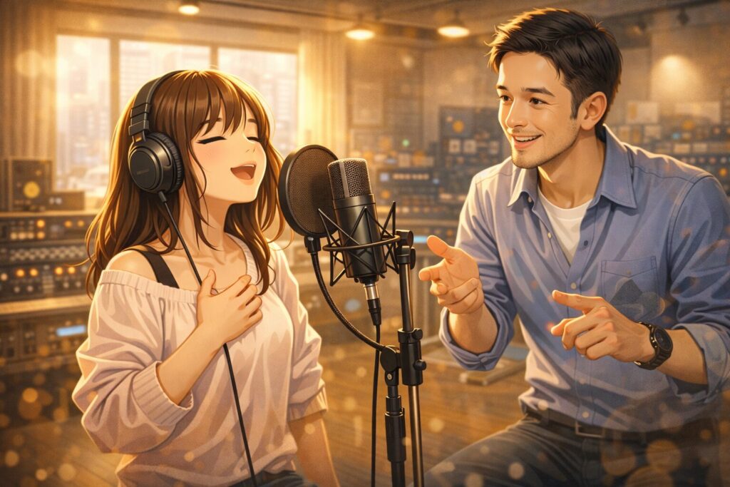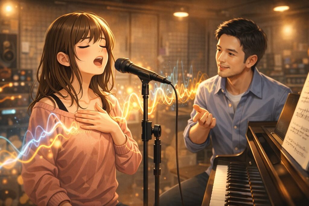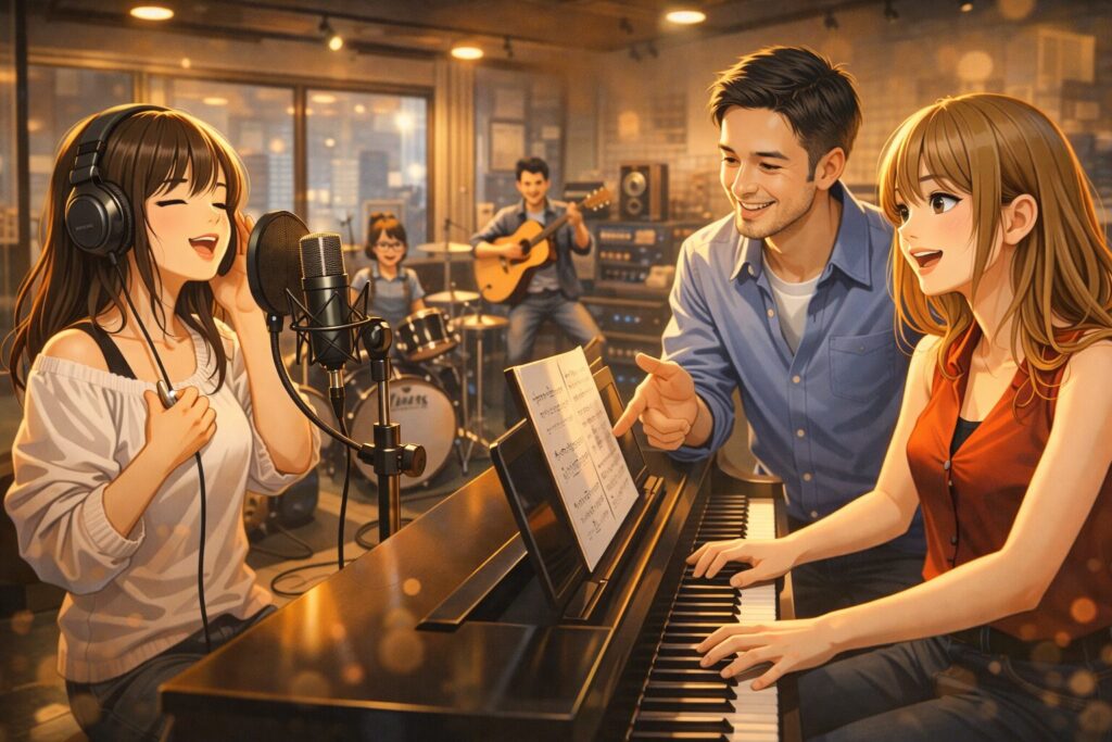 🔵 ボーカルの上達には、発声・呼吸・リズムといった基礎を学びながら、無理なく継続できる環境を選ぶことが役立つと考えられます。
